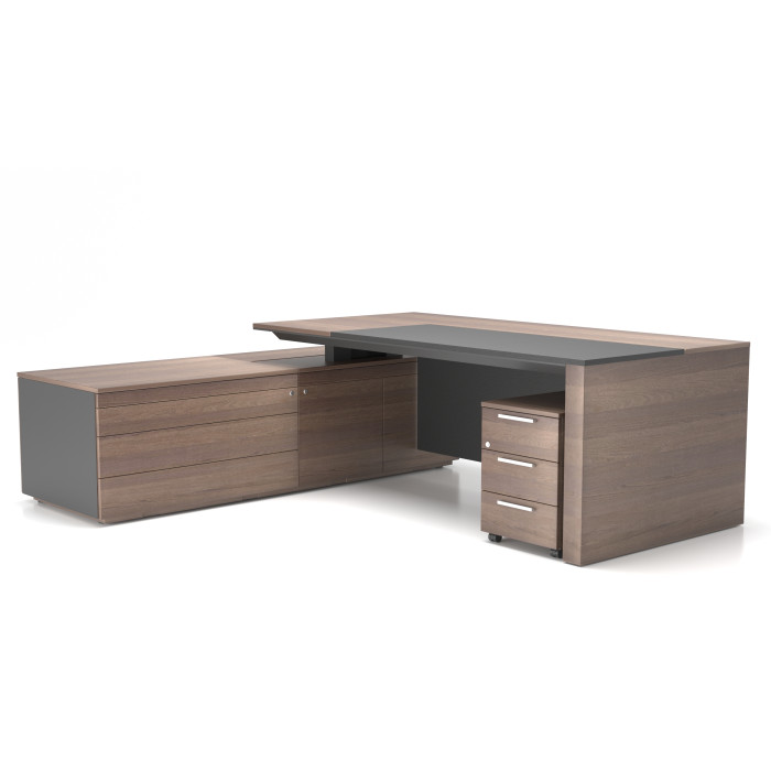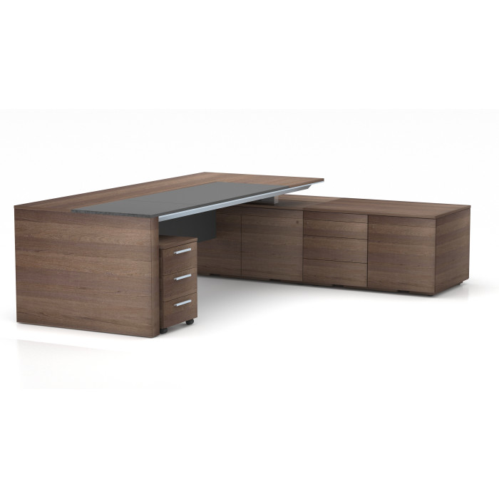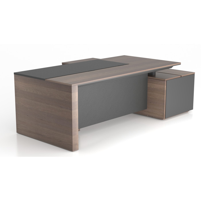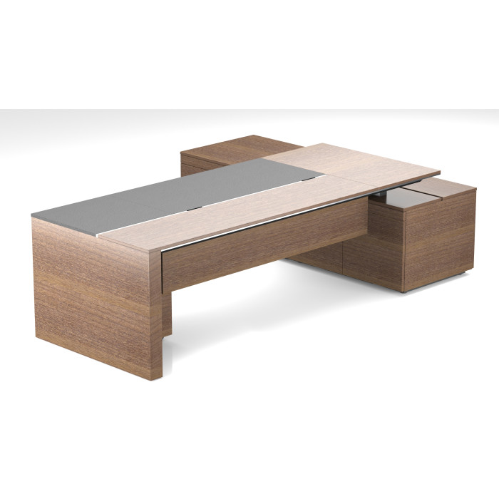 مكتب "Ono" التنفيذي بهيكل مكسو يعكس صورة متميزة لمكتب راقي وتنفيذي، وقد صُمم ليدوم مع مرور الوقت. سطح العمل متين وصلب، وهو مكون من سطح علوي وسطح سفلي مصنوعين من المعدن للحصول على سُمك إجمالي يبلغ 75 مم. يكتمل الشكل الجمالي للسطح بإطار محيطي من الألومنيوم كميزة مميزة لكامل المجموعة. يتكامل السطح مع الهيكل ليشكل نظامًا واحدًا. أما الجوانب الهيكلية المصنوعة من الخشب أو الميلامين فتبلغ سماكتها 90 مم وتم تصنيعها بتقنية الطي. المواد: مزيج من القشرة الخشبية أو الميلامين، الجلد، والألومنيوم التخزين: 2 أبواب مفصلية مع رفوف و3 أدراج قابلة للسحب شكل السطح: مستطيل الأحجام المتوفرة خلال فترة التسليم: 2150 عرض × 2000 عمق × 750 ارتفاع مم 2350 عرض × 2000 عمق × 750 ارتفاع مم 2550 عرض × 2000 عمق × 750 ارتفاع مم 2750 عرض × 2000 عمق × 750 ارتفاع مم المصنع / بلد المنشأ: Frezza، إيطاليا