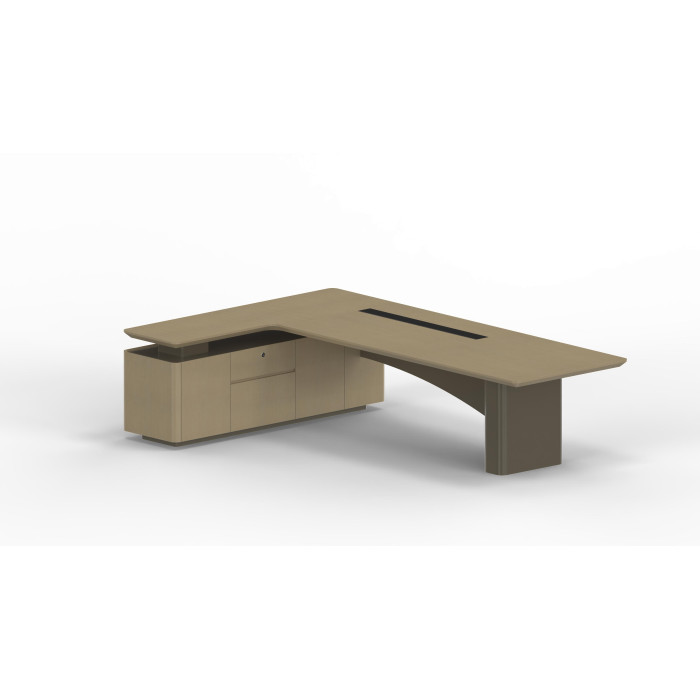 مكتب تنفيذي مع ملحق يسار/يمين. سطح مكتب غير منتظم الشكل مع ساق من البلاستيك المقوى بألياف زجاجية، سطح مكتب مستطيل الشكل مع ساق خشبية غير منتظمة، لوحة تواضع غير منتظمة وخزانة جانبية. ◊ سطح المكتب: سطح مكتب مستطيل الشكل مع لمسة نهائية من الخشب. سطح المكتب بسمك 54 مم. ◊ التخزين: خزانة جانبية مع سطح مطلي بطلاء نقي وجسم من الخشب، بابان ودرجان مع قفل ذكي لبصمة الإصبع، مساحة وحدة معالجة مركزية واحدة. يوجد حامل قرطاسية صغير على سطح المكتب للتخزين. ◊ إدارة الأسلاك: صندوق أسلاك قابل للطي مع مقبسين للطاقة ومقبس بيانات واحد، ومنفذا USB. ◊ الارجل: ارجل خشبية غير منتظمة الشكل مع طلاء نقي بالورنيش. الحجم: 2400 عرض × 1800 عمق × 760 ارتفاع مم الشركة المصنعة/ بلد المنشأ:- Saosen، جمهورية الصين الشعبية