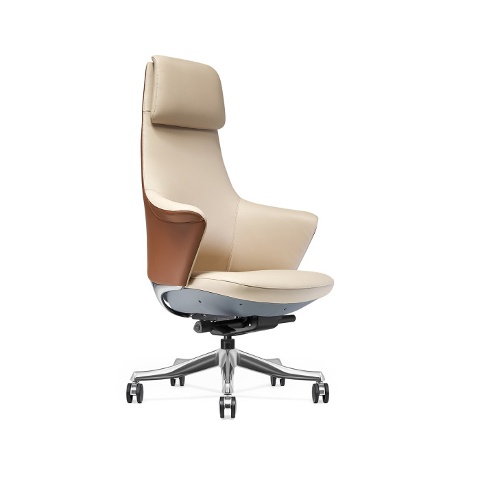 كرسي تنفيذي مرتفع الظهر، مبطن بالجلد الطبيعي مع إسفنج مصبوب من الداخل. مسند ذراع من الجلد المنحني، آلية Donati. إمالة متزامنة، خزانة بأربعة أوضاع مختلفة، مقعد منزلق قابل للتعديل. قاعدة من الألومنيوم بخمس نجوم مع عجلات.