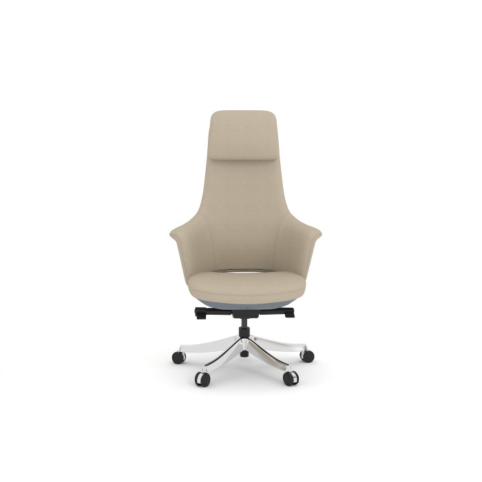 كرسي تنفيذي بمسند ظهر مرتفع، جلد طبيعي مبطن بإسفنج مصبوب من الداخل. مسند ذراع من الجلد المنحني، آلية Donati. إمالة متزامنة، خزانة بأربعة أوضاع مختلفة، مقعد منزلق قابل للتعديل. قاعدة من الألومنيوم بخمس نجوم مع عجلات.